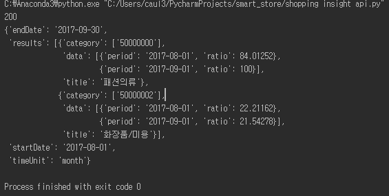 body = "{\"startDate\":\"2017-08-01\",\"endDate\":\"2017-09-30\",\"timeUnit\":\"month\",\"category\":[{\"name\":\"패션의류\",\"param\":[\"50000000\"]},{\"name\":\"화장품/미용\",\"param\":[\"50000002\"]}],\"device\":\"pc\",\"ages\":[\"20\",\"30\"],\"gender\":\"f\"}";
