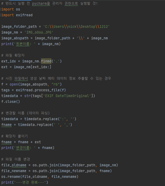 그리고 나서 실행만 하면 아래와 같이 사진 이름이 변경되었다는 출력결과가 나옵니다.